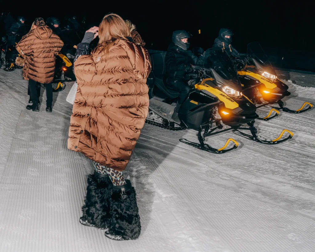 Those who glided down the trails could take in views of estates owned by people like Laurene Powell Jobs, whose $105 million house was near the Roaring Fork River. The Moncler weekend came to a close on a clear night when a fleet of 160 sport utility vehicles took the guests to a check-in location, where each was given a wool knit hat, gloves, and a chocolate-brown puffer cape. From there, they boarded one of the 170 snowmobiles hired for the occasion to take them along zigzagging trails to a snowy landscape called the Meadow.