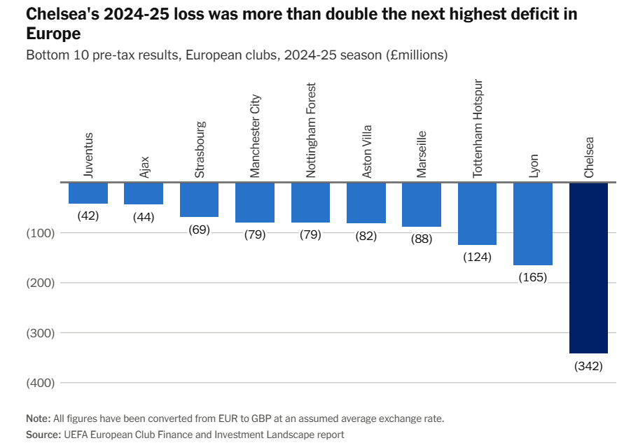 Chelsea booked the highest pre-tax loss in English football history in the 2024-25 season, per data released by UEFA.