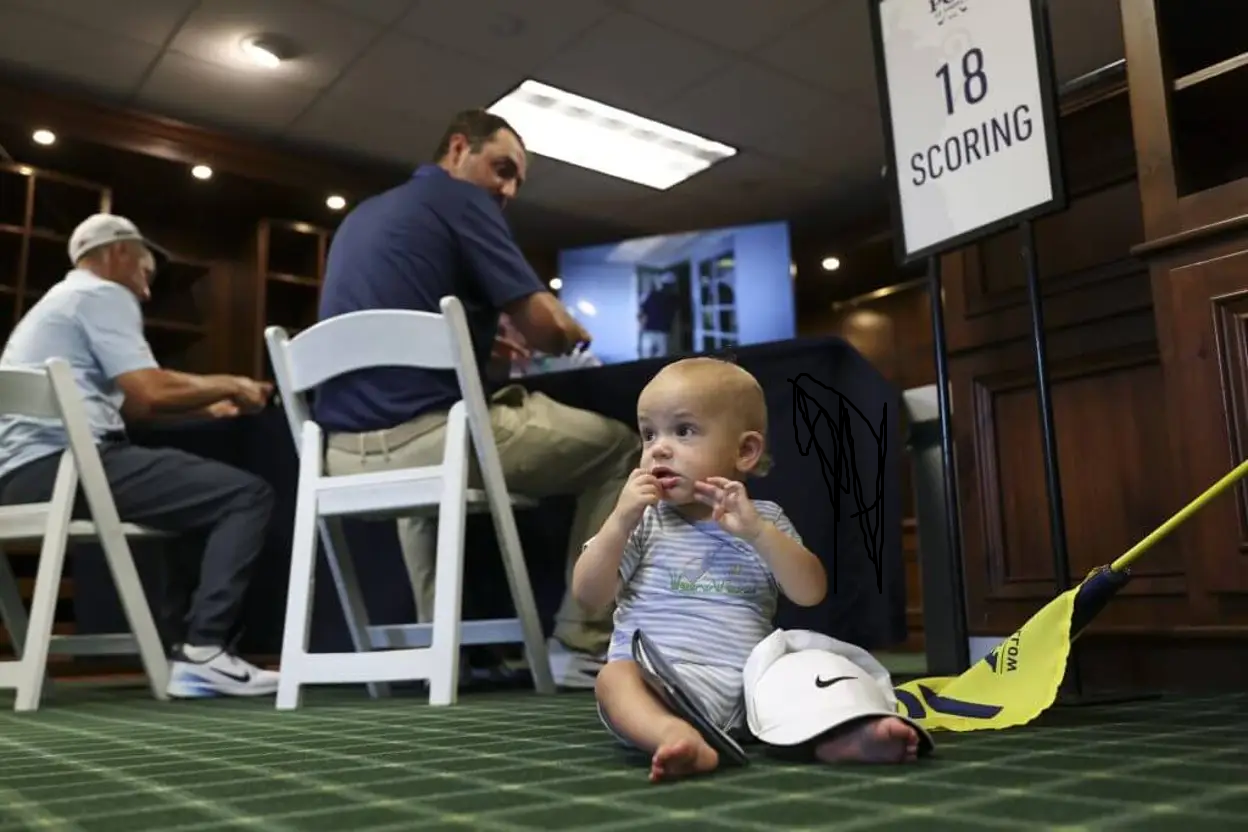 Knowing to give Bennett his hat and the scorecard holder from his back pocket to play with, Scheffler laid him down and had to go sign his card. Achieved Dad levels.