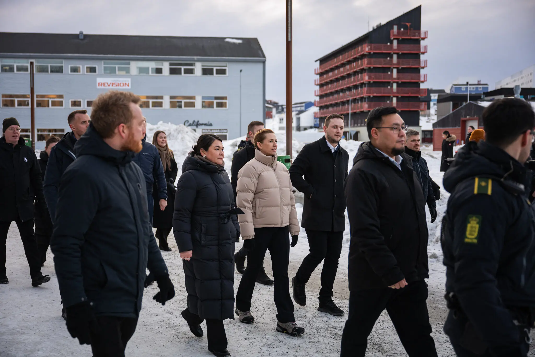 On Friday, the mayor of Nuuk, Greenland, Avaaraq Olsenand, Prime Minister Jens-Frederik Nielsen of Greenland, and Prime Minister Mette Frederiksen of Denmark, wearing a tan coat, embarked on a meticulously planned stroll through the city. Jonathan Nackstrand/Agence France-Presse via Getty Images