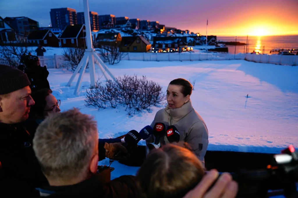 Mette Frederiksen, the prime minister of Denmark, addresses the media on Friday in Nuuk, Greenland. Credit: Agence France-Presse/Getty Images/Mads Claus Rasmussen/Ritzau Scanpix